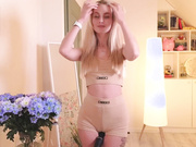 "Blonde bombshell with sweaty armpits shows exposed fat ass while teasing viewers."