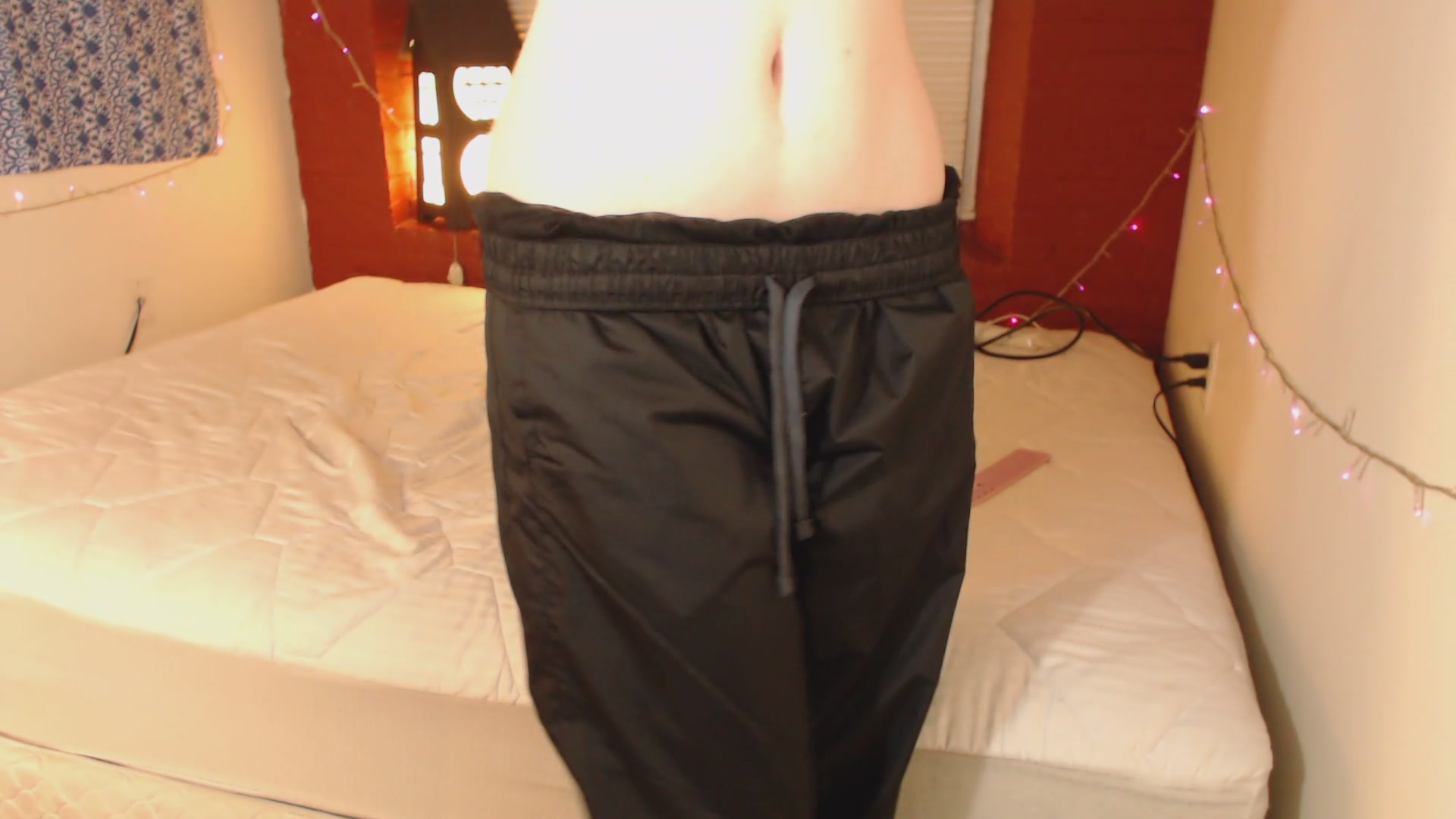 Model edges and spanks herself in windpants